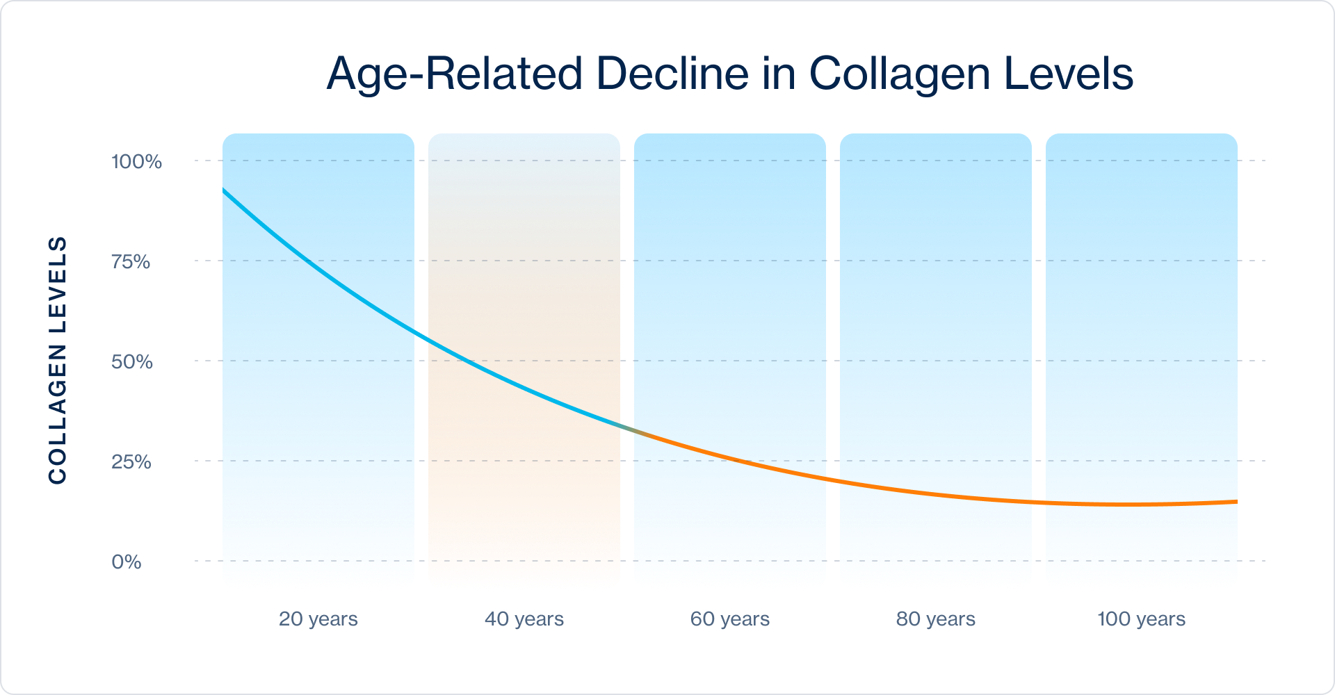 By your mid-20s, collagen, the structural protein that keeps skin firm and plump, begins to decline by about 1% each year. By age 60, most people have lost more than half of their natural collagen. This loss contributes to wrinkles, sagging skin, and joint discomfort.